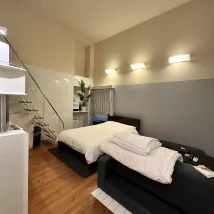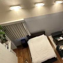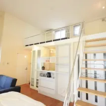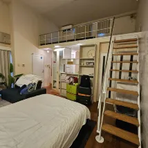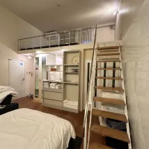 周辺の生活機能も充実しており環境も良く、部屋は広くはありませんが高さがあるので圧迫感はありません。必要なものが揃った小さなキッチンが備わっています。唯一の欠点はトイレが1つしかないので、メンバーが多い場合には使用できないことです。