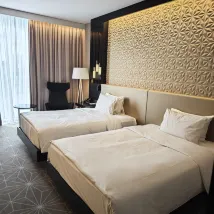 ホテルの場所は市内中心部にあり、近くのショッピングモールに便利です。ホテルには設備が充実しており、部屋は清潔で、スタッフの態度は良く、周囲の環境は美しいです。