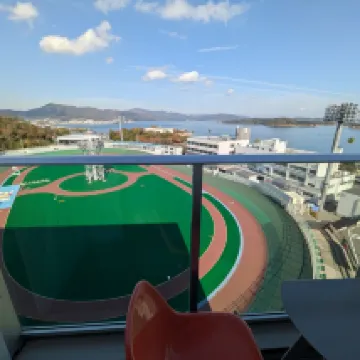 写真のとおり、競輪場が目の前にあり、海も見渡せる、非日常感は抜群です。部屋も1人用のスタンダードなのは狭いですが、テラスもあり快適。あと朝食が美味しい!競輪のトラックを見渡しながら食べるのもとても気持ち良かったです。が、駅から遠いのだけは辛かった…歩いて25分は直島に行ったり移動する場合は適さないと思います。ただ、行きの最初のタクシー代はレシートを渡せば払ってくれます。あと、夜の宇野駅にタクシーがいない場合も呼べば5-10分で来てくれます。
