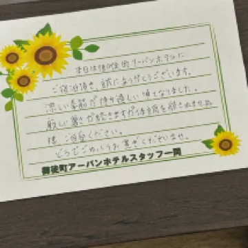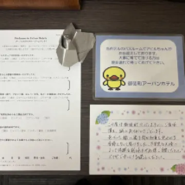 チェックインチェックアウト時共にフロントの方が愛想が良くて好印象でした。 お部屋は壁に年季は感じましたが特段気になることもなく心地よく過ごせました。 手書きのメッセージに折り紙、バスルームのあひるちゃん全部にほっこりしました(՞っ ̫ ⊂՞)♡