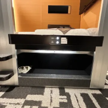 写真のイメージ通りで大満足です!下の段は荷物スペース、上がベッドという作りで、セキュリティもしっかりしており、安心して利用できました。広々として快適な共用ラウンジには、本やドリンク、リクライニングチェアまで完備されており、とてもリラックスできます。有料で衣類乾燥機が利用できるのも助かります。都営浅草線、都営大江戸線からのアクセスも非常に便利でした。