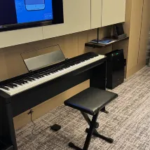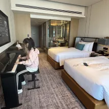 ホテルは比較的新しいです。各部屋に電子ピアノがあります。フロントデスクでは簡単な英語で対応できます。ベッドは少し小さいです。立地は特に良くありません。