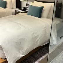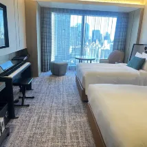 部屋は広く、夜はロビーにピアノの音楽が流れ、床から天井までのガラス張りの夜景もなかなか良いです。東京としてはとても広いお部屋で、ダブルベッドの高さは1.3メートルありますので、ご家族でのご利用に最適です。