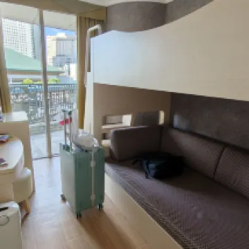 部屋は2段ベッド(上はベッド、下はソファ)で、各部屋に半円形のバルコニーがあり、地下鉄に面しています。 両国駅から道路を挟んですぐです。 近くにはファミリーマート、マクドナルド、吉野家があります。 不満な点は、通路が狭く、スーツケースを広げるのが難しいことです。