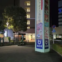 鳥取JR駅の北口を出て、徒歩約5分です。受付のスタッフはとても親切で、ホテルの真向かいにレンタカー会社が2つあります。タイムズとニコノボレンタカーです。4人乗りの車を3日間14,630円で借りることができました。午後9時まで無料の酒類バーがありました。