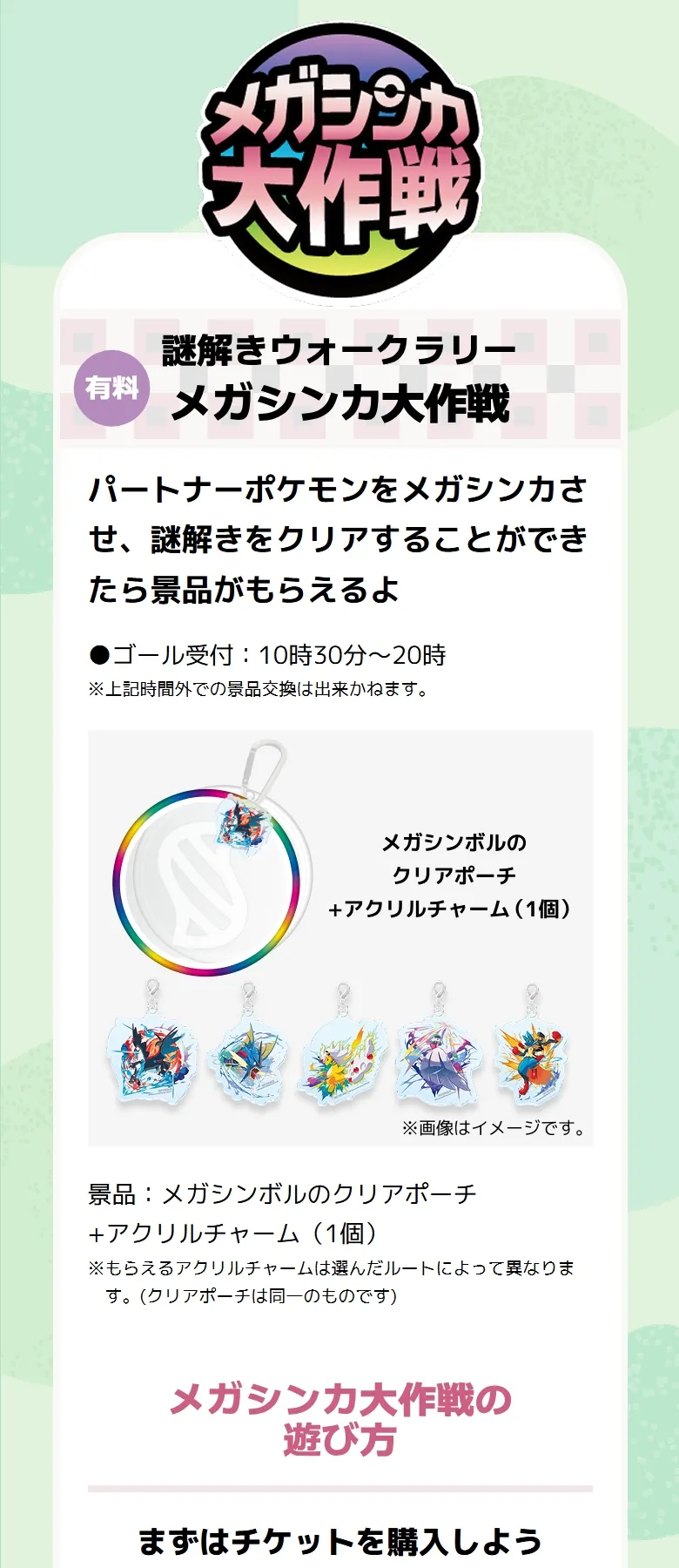 ※ラリーをクリアした方への景品:メガシンボルのクリアポーチ、アクリルチャーム(※購入したラリーコースに対応したパートナーポケモンのアクリルチャームが付属します)