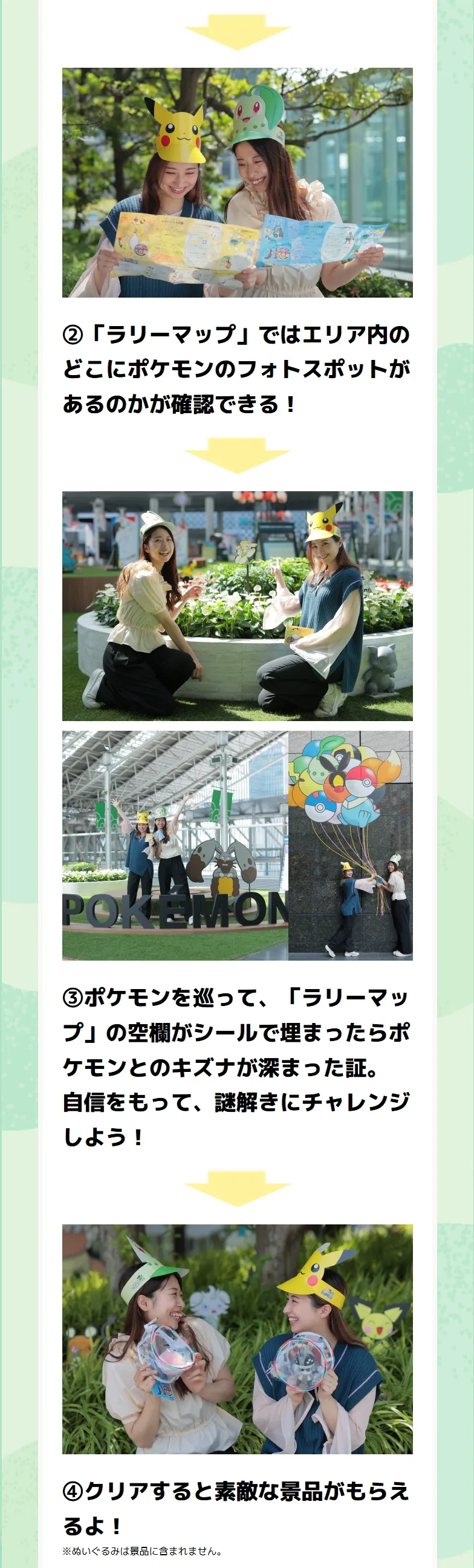 ※ラリーキット:ラリーマップ、作戦シール、サンバイザー(ピカチュウ、チコリータ、ポカブ、ワニノコの 4 種から 1 種お渡しします。種類は選べません)