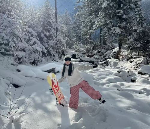▲ 雪の森の中で、白いコートにピンクのチェックパンツを着た女性がスキーボードを持ってポーズをとり、陽光が雪景色を明るく照らし、軽快な雰囲気が広がっています。
