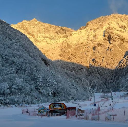 ▲ 夕焼けが雪山に広がり、スキー場の小屋にはカートゥーンが描かれ、ピンクのネットがコースを囲み、暖かな光が冷たい冬を包む、ロマンチックで柔らかな光景