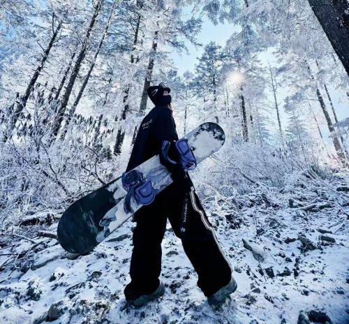 ▲ 雪の森で、黒い服を着た人々がスキー板を担ぎ、陽光が木々の間から差し込み、樹氷が木々を覆う。冷たいトーンの風景が冬のクールな雰囲気を醸し出している。