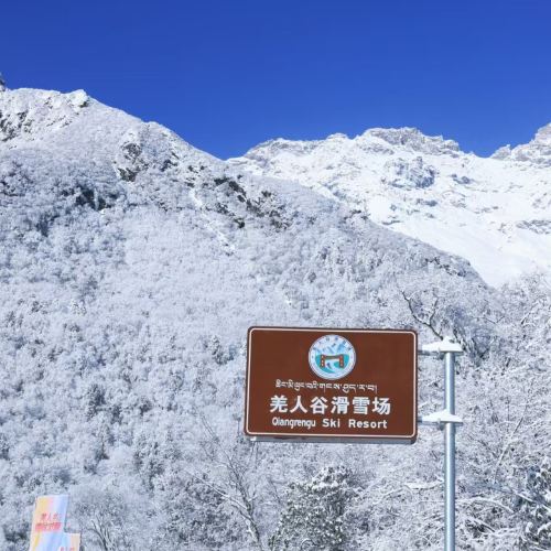 ▲ 羌人谷スキー場の看板が雪の森の中に立ち、背景には雪山と霧氷が広がり、多言語表示が青空に映えて、冬のスキー場の識別性が最大限に高まっています。
