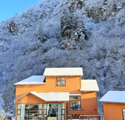 ▲ オレンジ色の木造小屋は雪に覆われ、軒先にはつららが下がり、裏山には霧氷が林一面に広がっています。暖かな黄色の建物と冷たい白い雪景色が互いに映え、静かで温もりある光景です。