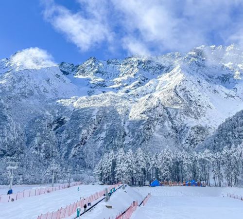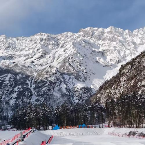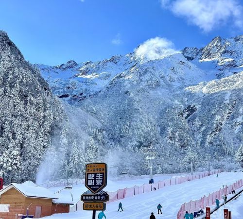 ▲ 汶川羌人谷スキー場、看板には「一生に一度は訪れるべき」と書かれています。雪山のケーブルカーが晴れ渡る空に映え、スキーヤーが点在する景色は美しく心地よいです。