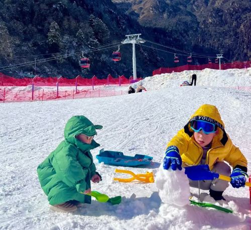 ▲ 雪の上で二人の子供が雪遊びをしている。黄色い服の子は雪だるまを作り、緑色の服の子はシャベルを持ち、ケーブルカーが背景に映え、子供らしい楽しさが溢れている。