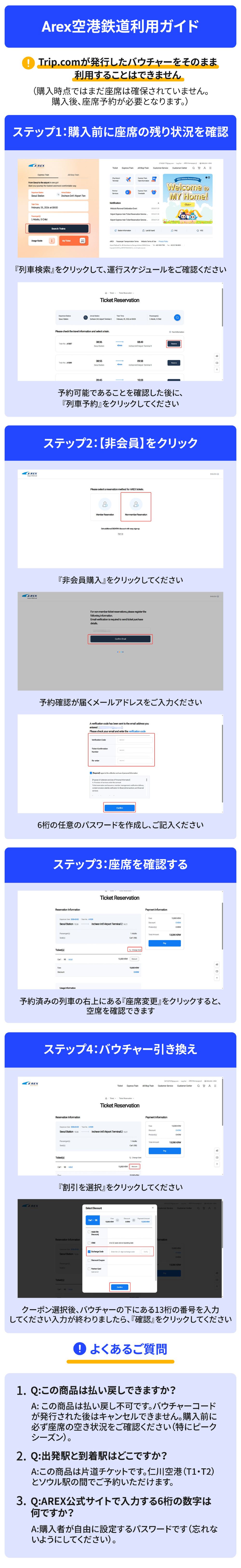現地でご利用いただけない場合や、事前にAREXウェブサイト(https://www.airportrailroad.com/)で座席の確認や予約をしていない場合、払い戻しはいたしかねます。
