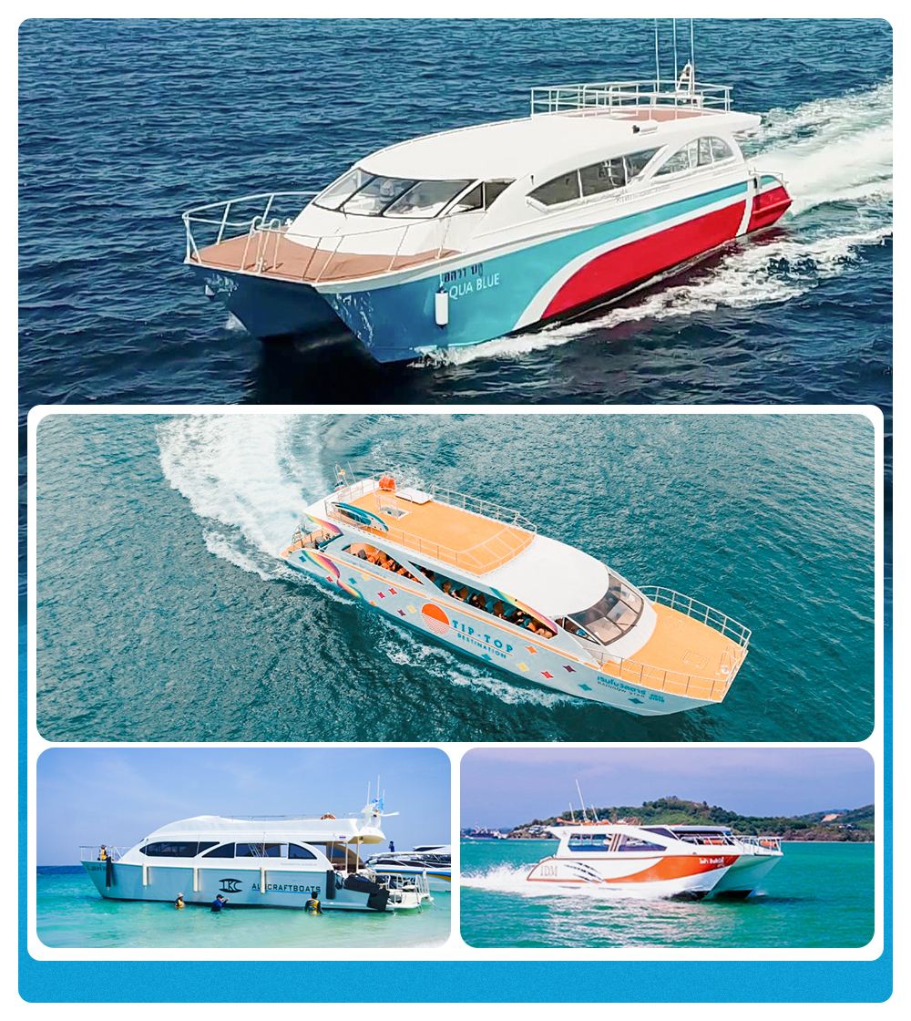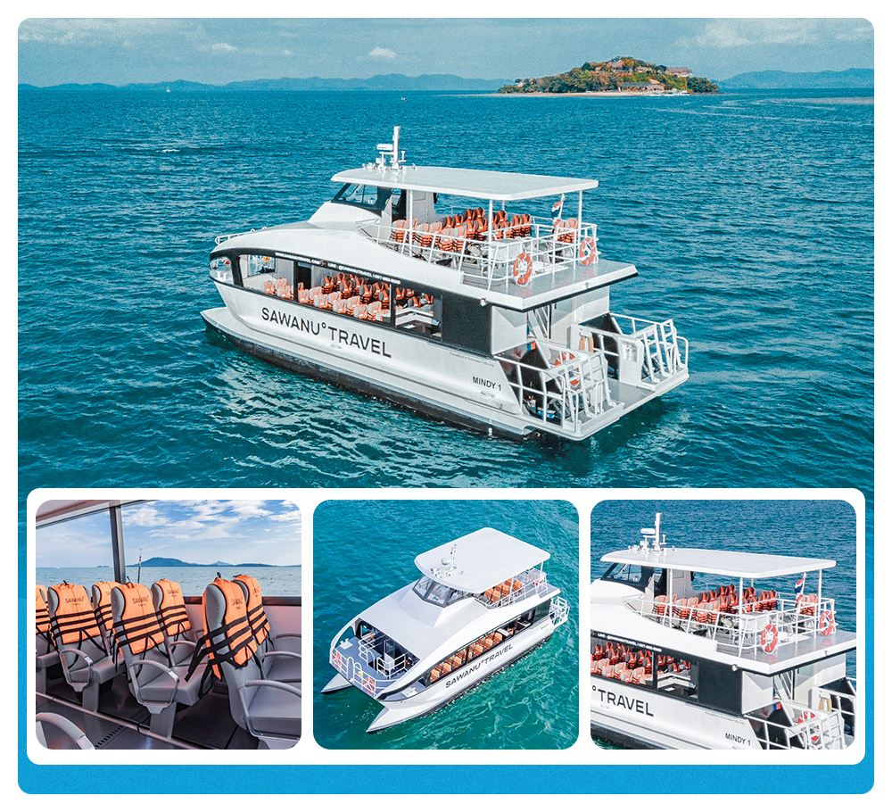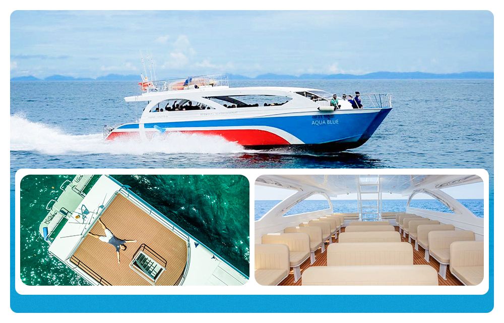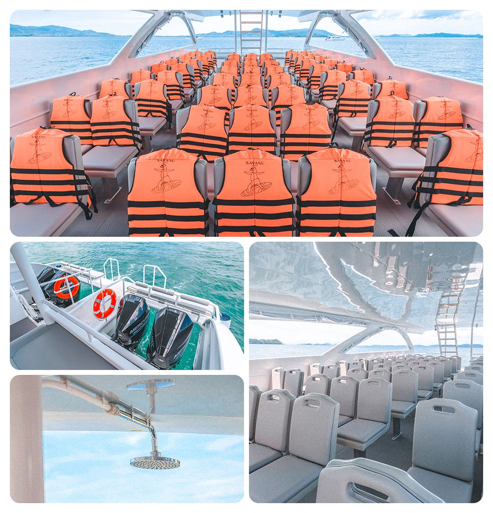 純白の外観+ツインエンジン、美しさ、速度、安定性を兼ね備え、島への到着時間を30分短縮。快適な横並びのソファシート、船内から360°の海景を楽しめる、船首のサンデッキで写真撮影が超人気。