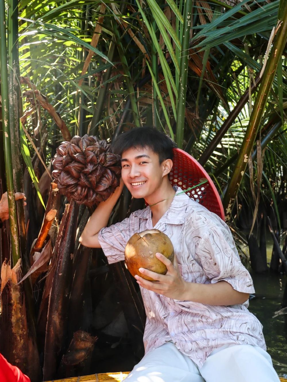 メコン川を木造船でクルーズ。川沿いの養魚場や魚の生活風景を見学。麟島を経由し、約20分でタイソン島へ。
