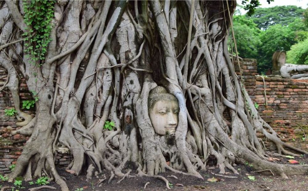 ガイドブックなどで一度は目にする、ワット・マハタート。印象的な木に包まれた仏頭で有名な寺院です。1600年代中頃に胴体から落ちた仏頭が、水平に保たれたまま、根本にとりこまれた現在の姿は、奇跡そのもの。アユタヤ観光で最も人気のある寺院です。