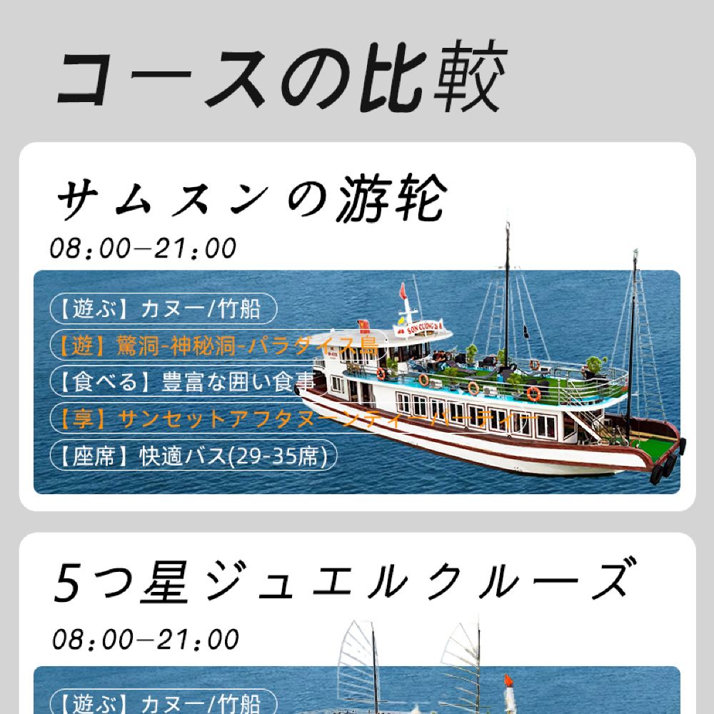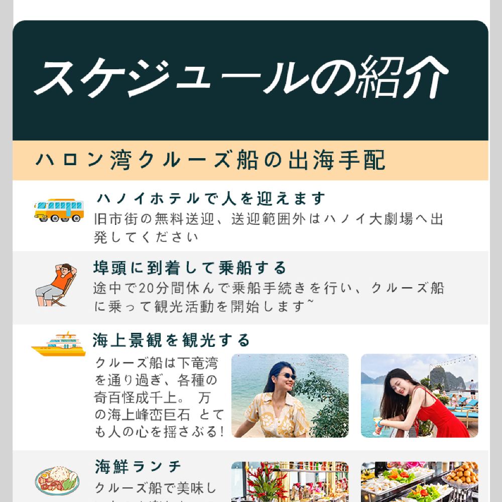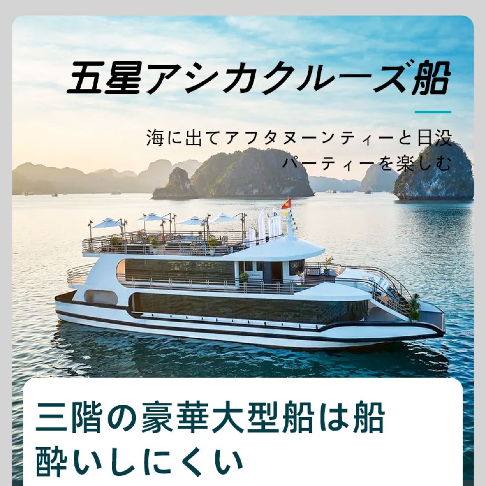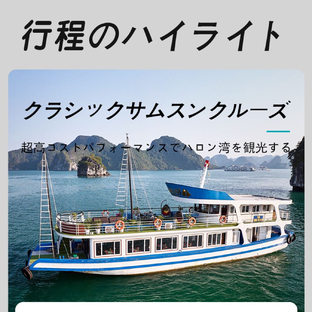 1. [独立経営の徹底] ハロン湾航路で30年の実績を持つ当社は、ボート会社と直接契約を結んでいるため、中間業者を介さず、質の高いサービスをご提供できます。