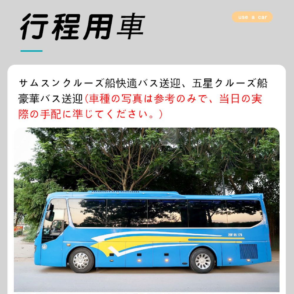 3. [正規ライセンス取得、安全保証] すべての車両とボートは5年以内のもので、広々とした室内空間をご提供します。当社のブランドオペレーション、高品質なサービス、そしてシームレスなコーディネーションにより、安心してご旅行いただけます。