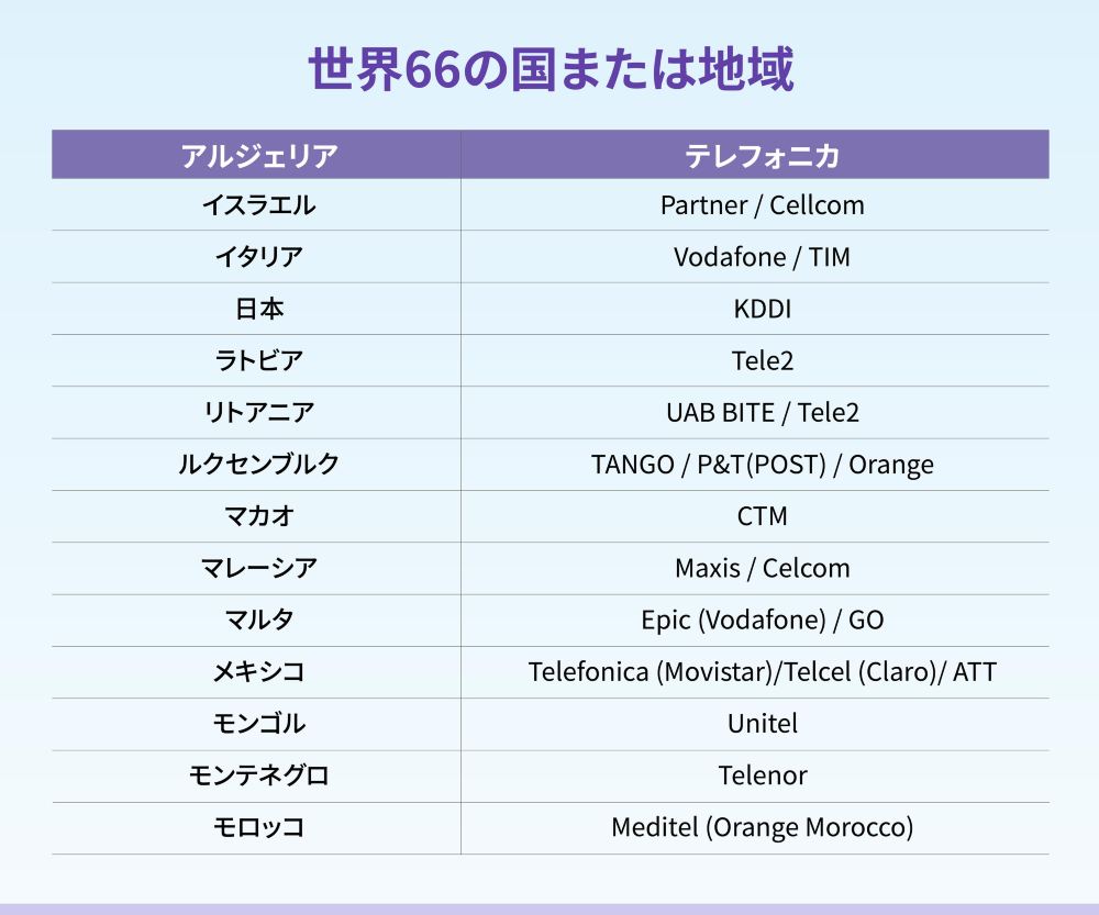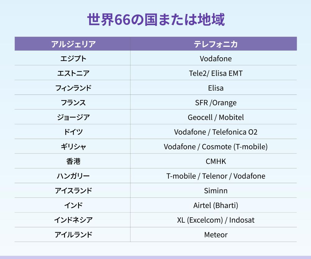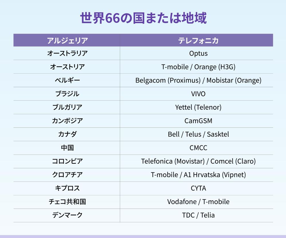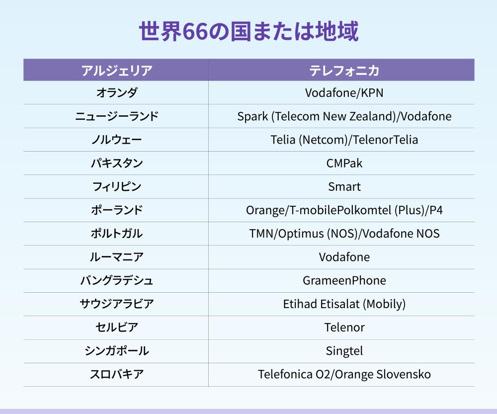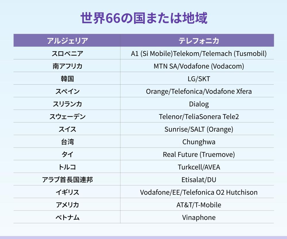 通信エリア:(カバレッジエリアは、各国の本土地域のみを対象とし、これらの国の海外領土や関連地域は含まれません。例えば、アメリカ合衆国はカバーしますが、グアムはカバーしません。) アラブ首長国連邦、エジプト、アイルランド、エストニア、オーストリア、オーストラリア、パキスタン、ブラジル、ブルガリア、ベルギー、アイスランド、ポーランド、デンマーク、ドイツ、バングラデシュ、フランス、フィリピン、フィンランド、コロンビア、ジョージア、韓国、オランダ、モンテネグロ、カナダ、カンボジア、チェコ、クロアチア、ラトビア、リトアニア、ルクセンブルク、ルーマニア、マルタ、マレーシア、アメリカ、モンゴル、モロッコ、メキシコ、南アフリカ、ノルウェー、ポルトガル、日本、スウェーデン、スイス、セルビア、キプロス、サウジアラビア、スリランカ、スロバキア、スロベニア、タイ(北大年、ナラティワ、イェラなどの地域はカバーしていません)、トルコ、スペイン、ギリシャ、シンガポール、ニュージーランド、ハンガリー、イスラエル、イタリア、インド、インドネシア、イギリス、ベトナム、中国本土、マカオ、台湾、香港