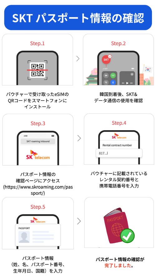 ・認証に使用されたパスポートはeSIMの有効期限終了まで登録されたままになります。この期間中、そのパスポートを他のSKT SIMカードやeSIMの認証に使用することはできません。有効期限が終了すると、そのパスポートは再度認証に使用できるようになります。