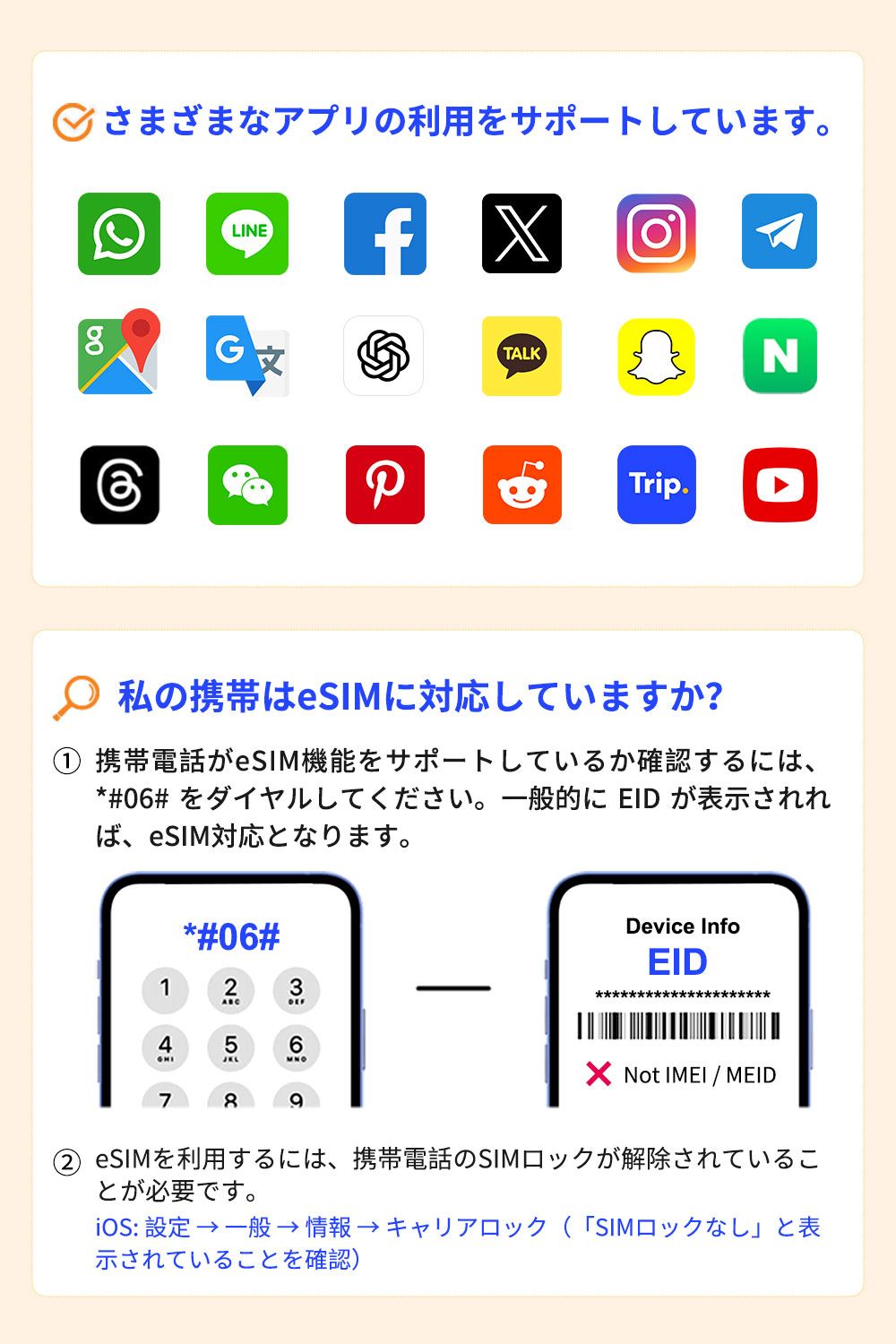 デバイスはSIMロック解除されていること:キャリアに確認して、デバイスがSIMロックされていないことを確認してください。購入前にこれらの条件を確認して、eSIMを正常に使用できることを確認してください。