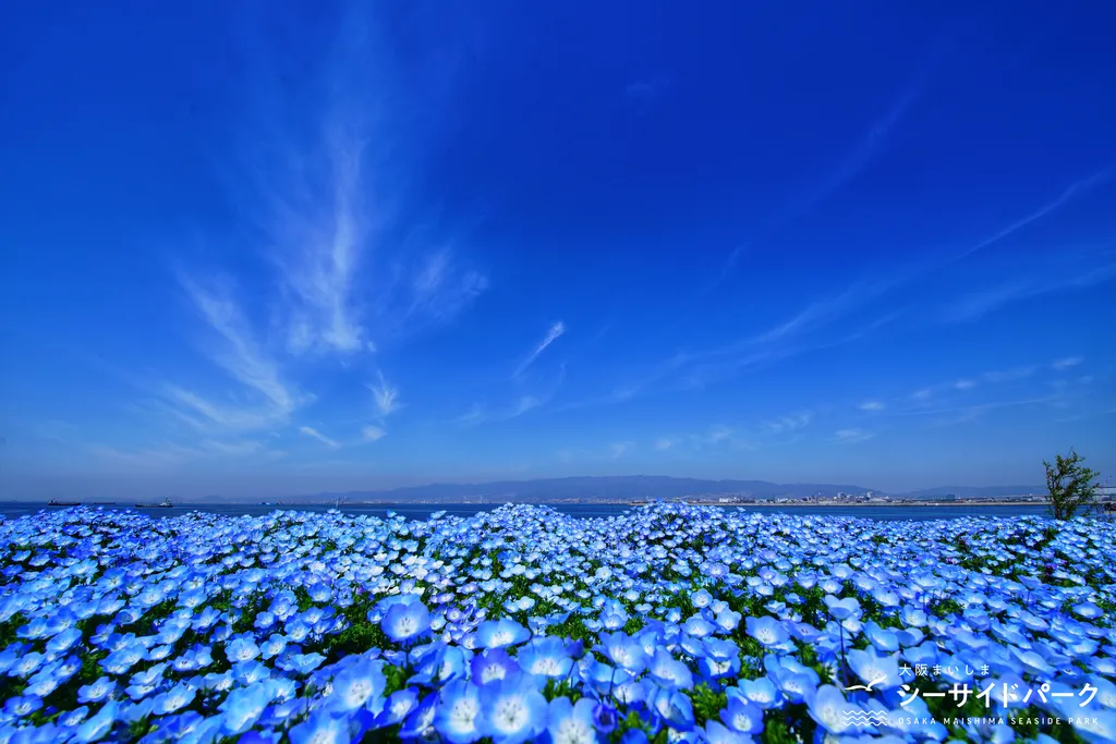 大阪湾を望む広大なシーサイドパークに約 44,000㎡ のネモフィラ畑が広がる、関西の春の大人気イベント。