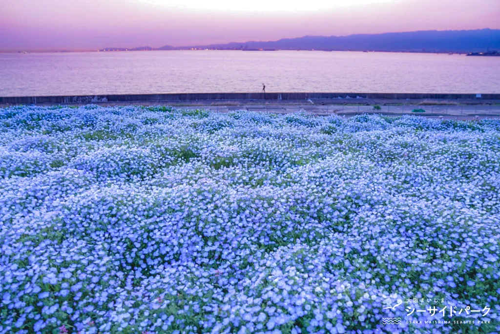 ネモフィラが見頃を迎える 4 月から 5 月にあわせて開催し、丘一面を青く染め上げるネモフィラと大阪湾の広大な海、青く澄み渡った空のハーモニーは、ぜひ写真に収めたい絶景です。